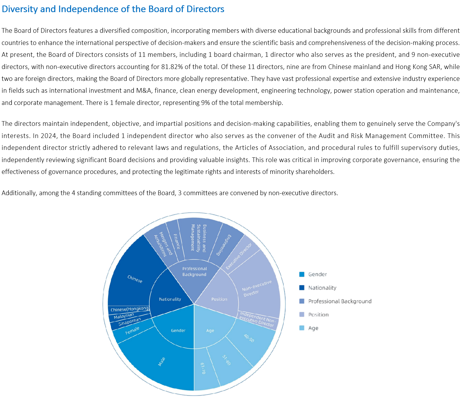 The ESG and Related-party Transaction Committee is primarily responsible for deliberating the?Company's sustainable development issues, examining the establishment, processes, and systems of?the Company's ESG framework, reviewing the Company's ESG vision, strategy, objectives, and social?responsibility project plans, evaluating the operation of the Company's ESG framework, identifying?pertinent risks and opportunities, and providing recommendations to the Board of Directors to?ensure the sustainability of corporate governance. The committee is also responsible for formulating?management policies concerning related party transactions of the Company, overseeing and?reviewing such transactions to ensure compliance with relevant laws, regulations, and the Company's?internal policies, ensuring the compliance of these transactions. Furthermore, the committee regularly?receives updates on the Company's information disclosure and engagement with stakeholders,?supervising and guiding these efforts to enhance the transparency of the Company.